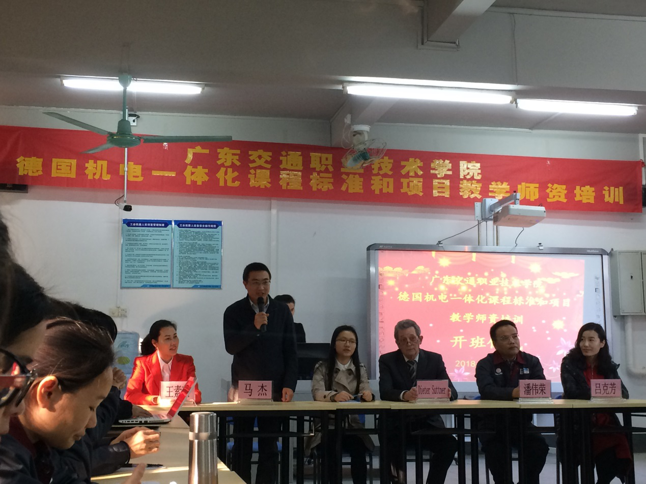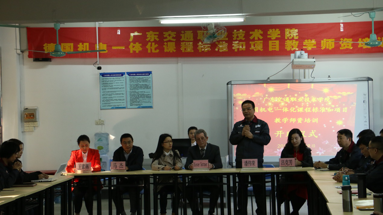 2018年1月19日上午,机电工程学院德国机电一体化课程标准和项目教学师资培训班顺利开班。开班仪式在16#106工业机器人实训室举行。德国工商协会IHK机电一体化考官和专家Dieter Suttner先生、机电工程学院院长潘伟荣、学校人事处(国际交流合作处)副处长马杰、广东恺鹏勒信息科技有限公司副总经理王素燕、北京尚鲲教育集团教研部吕克芳以及来自机电工程学院的26位参训教师参加了开班仪式。开班仪式由广东恺鹏勒信息科技有限公司项目经理程蕾主持。