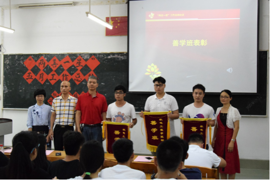 “两善一星”项目是加强学生在校期间乐学善学、追求高生活品质的教育实践,旨在通过对善学者、善学班和星级宿舍的评比和表彰,谱写学风校风建设新篇章。会议首先通报了机电工程学院5月份“两善一星”的评比情况,并向荣获善学班的班级颁发流动红旗、向荣获星级宿舍的集体颁发奖品。接着,来自善学班和星级宿舍的学生代表分别进行了经验分享。