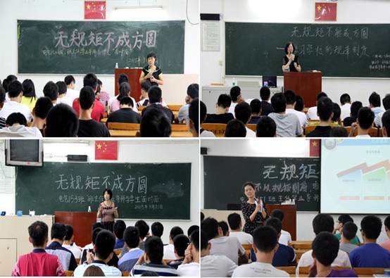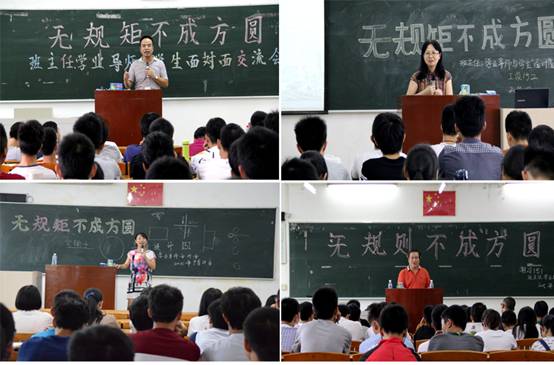 2015年9月21日是我校15级新生上课的第一天。当天下午2时,朱伟新书记等10名学业导师准时来到新生中,分班进行了“无规矩不成方圆”的主题见面会。见面会由各班班主任主持,班主任、学业导师围绕主题结合自己大学时期的学习经历,针对本班同学特点谈了对大学生学习、生活的体会、看法和期望。引导同学们树立和培育社会主义核心价值观,“勤学、修德、明辩、笃实”,德才兼修,为将来毕业后能在时代大潮中建功立业,成就自己的宝贵人生开好头、起好步!(文/江能兴 图/谭教航、王景添)