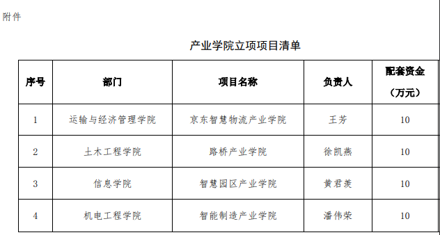 经形式审查、材料公示、校外专家网络评审、教学工作委员会审议、院长办公会审定等环节,现确定“京东智慧物流产业学院”、“路桥产业学院”、“智慧园区产业学院”、“智能制造产业学院”4个项目立项为产业学院项目,配套资金按10万元/项下拨,建设期为1年,一年后由学校组织验收。具体立项项目详见附件1,特此公布。