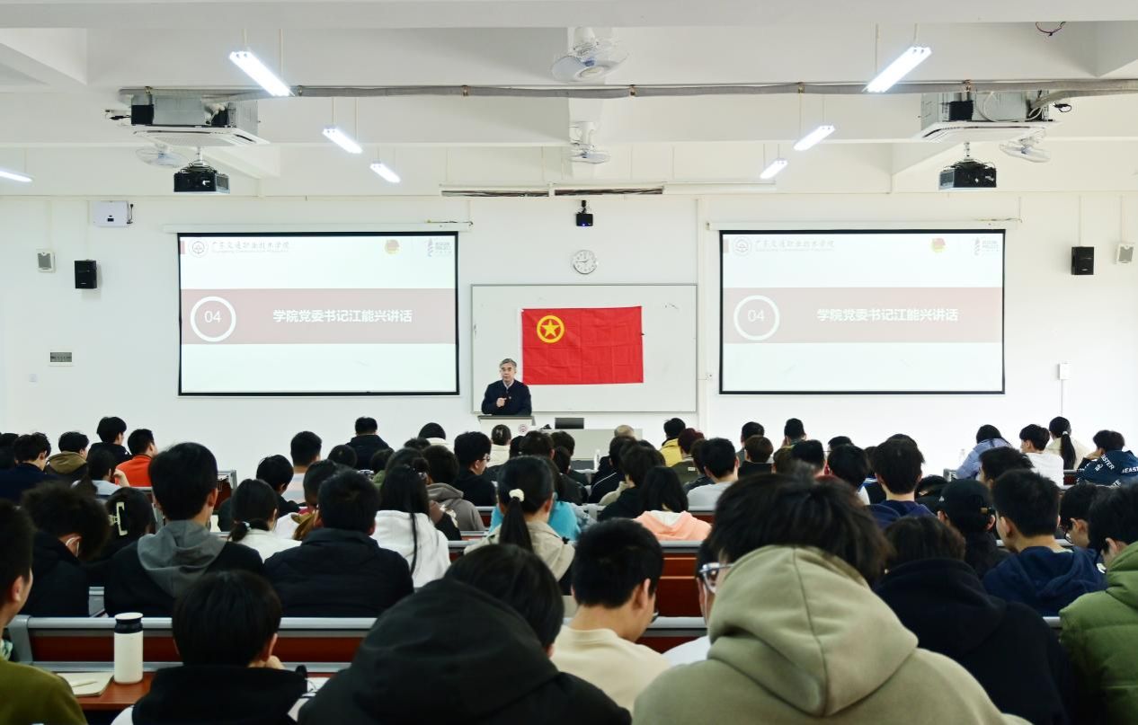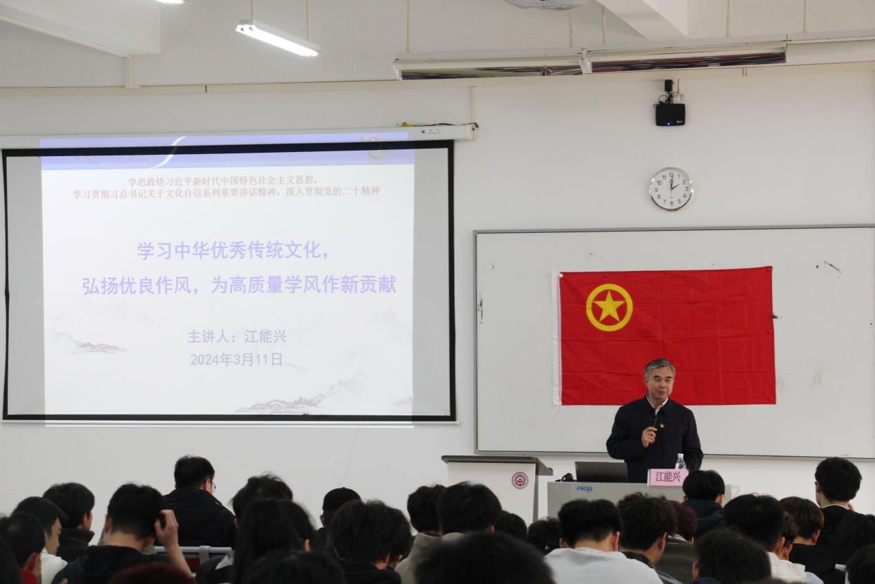 第一课上,江能兴以“学习中华优秀传统文化,弘扬优良作风,为高质量学风作新贡献”为主题讲第一课,围绕习近平总书记谈人文精神、谈中华优秀传统文化、儒家人文精神、学生干部“知行合一”“事上磨炼”中修身等方面,深刻阐释了中华优秀传统文化对自身建设、内涵提升的重要性,引导青年学生骨干要深入学习中华优秀传统文化,筑牢思想根基,强化使命担当。坚持用习近平新时代中国特色社会主义思想武装头脑、指导工作,扎实推进学院各项工作高质量发展,不断取得新成效,让青春在全面建设社会主义现代化国家的火热实践中绽放绚丽之花。