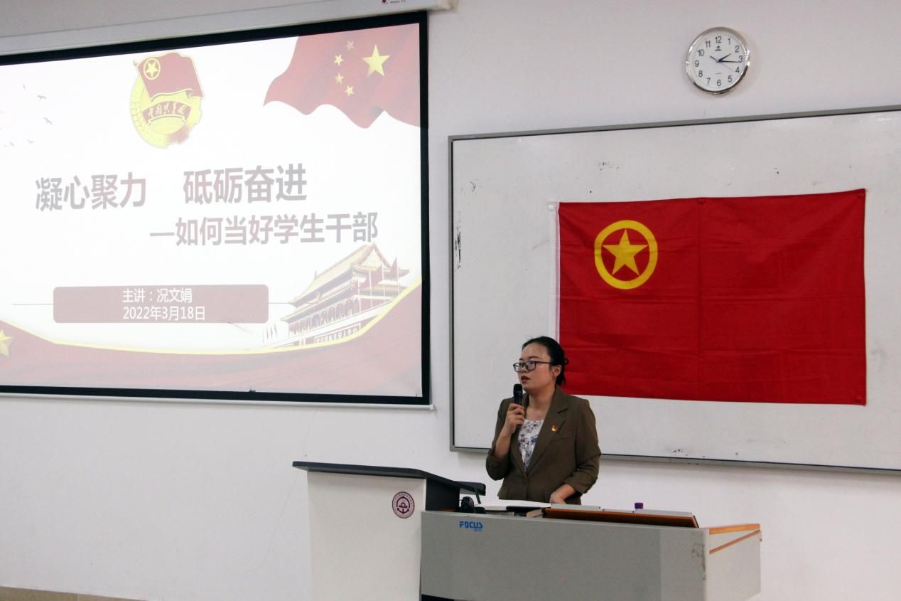 况文娟剖析了现阶段学生干部能力存在的不足,阐明了学生干部的角色定位,强调学生干部的综合能力不仅关乎学生组织的运行效率,更是校园文化建设中的重要一环。她鼓励全体学生干部要始终不忘初心使命,用心用情做好服务,不断创新工作思路,与学院发展同向同行。