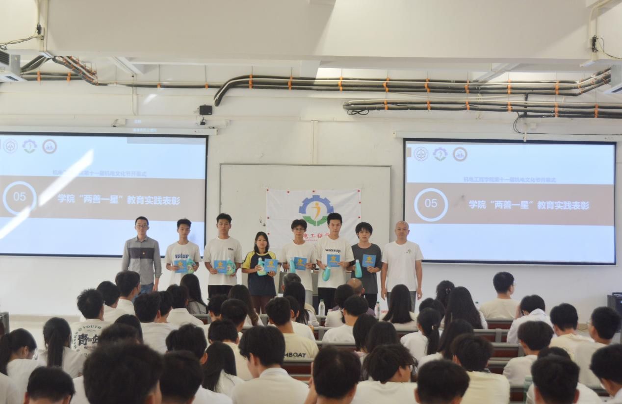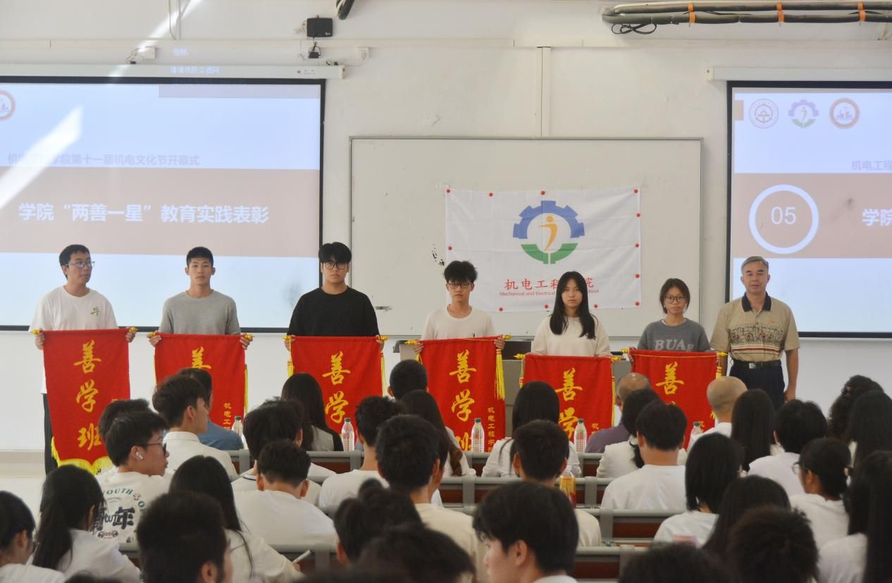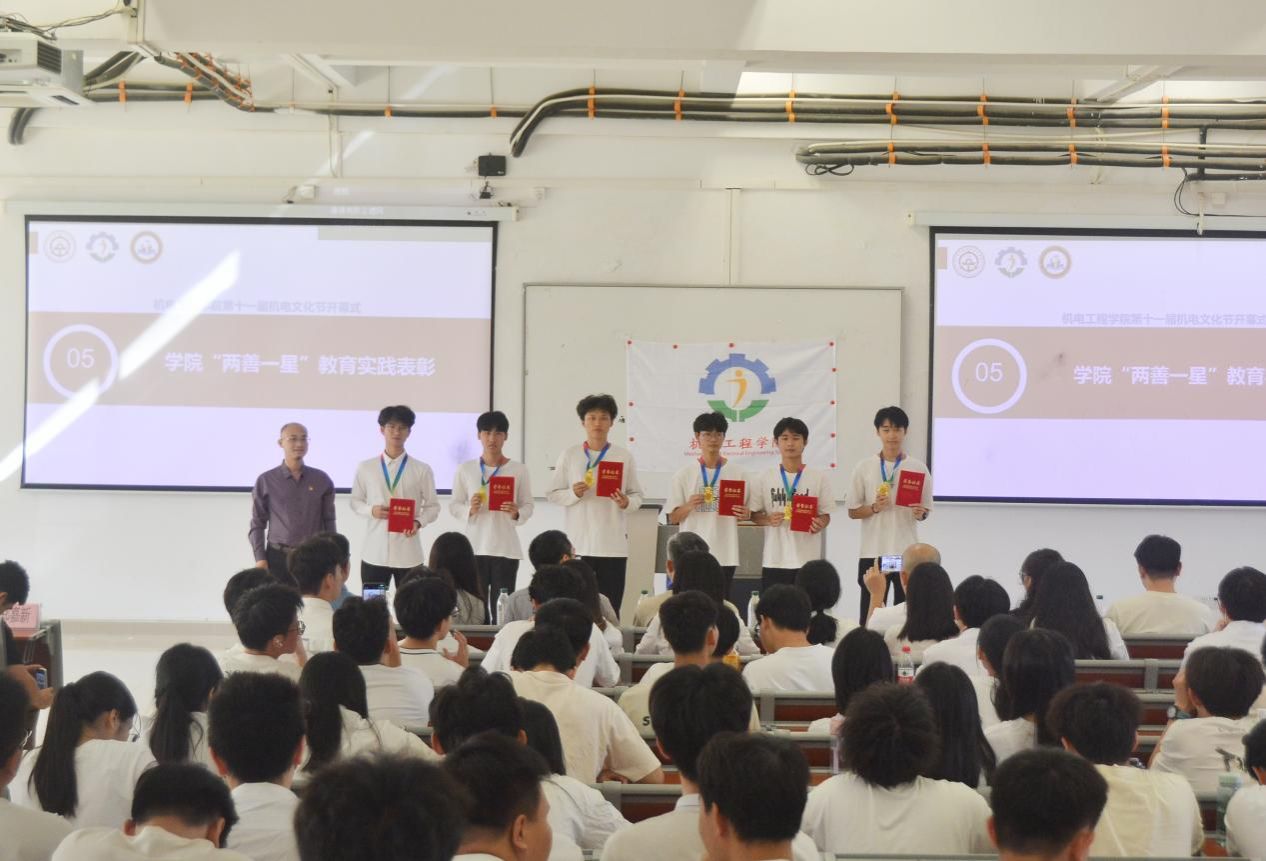 11月11日,机电工程学院第十一届机电文化节在笃实楼101顺利举办。本届文化节的主题为“青春有为当奋进,文化传承育新人”。机电工程学院党委书记江能兴、党委副书记刘元平,工业机器人专业主任林子其、班主任吴壮勇、辅导员、组织员,学生党员,学院团委、学生会各部门、工作室学生骨干,2022至2024级各班级班团干部,“两善一星”获奖代表等240余人参加了开幕式。