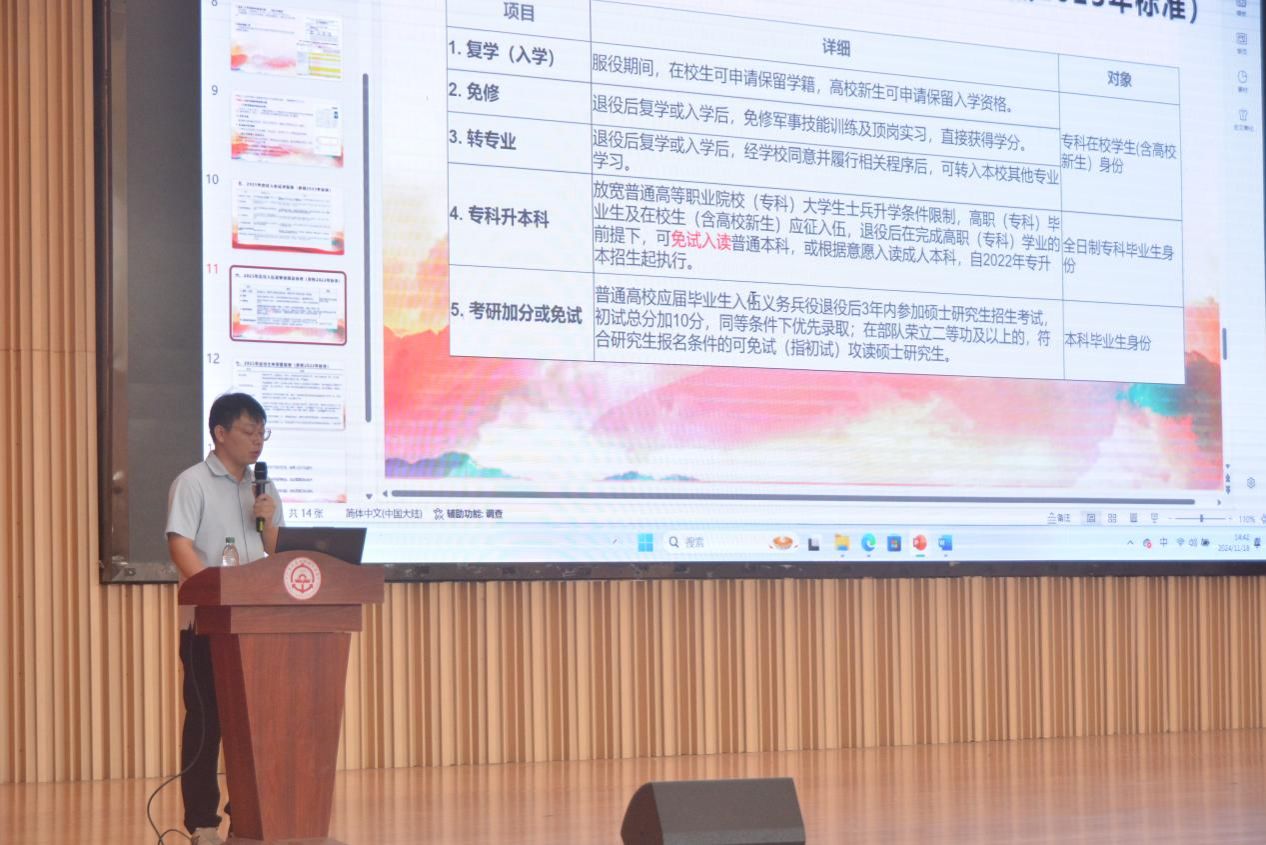 辅导员甘小丹介绍了2025届毕业生的就业工作日程安排,并针对获取招聘信息、填报就业信息、毕业生档案和在就业升学中出现的普遍性问题作解答。辅导员吴军进行2025年春季征兵宣传,围绕2025年春季征兵工作各阶段安排、入伍基本条件、报名入伍基本流程和入伍政策保障等方面进行详细讲解。