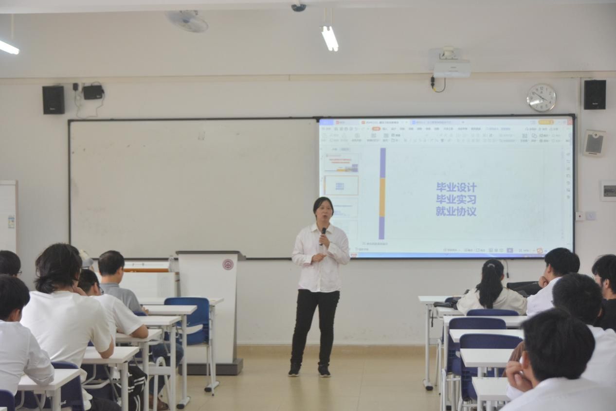 郝建豹围绕组织管理、过程管理、纪律管理、安全管理等方面详细讲解了毕业生岗位实习的管理细则,提醒同学们从思想上引起重视、行动上落实到位,顺利完成实习任务。郭新强调了毕业设计的重要性,指出毕业设计是同学们所学知识的系统总结和综合运用,更是检验自身专业素养和实践能力的关键环节,因此同学们都应高度重视毕业设计。