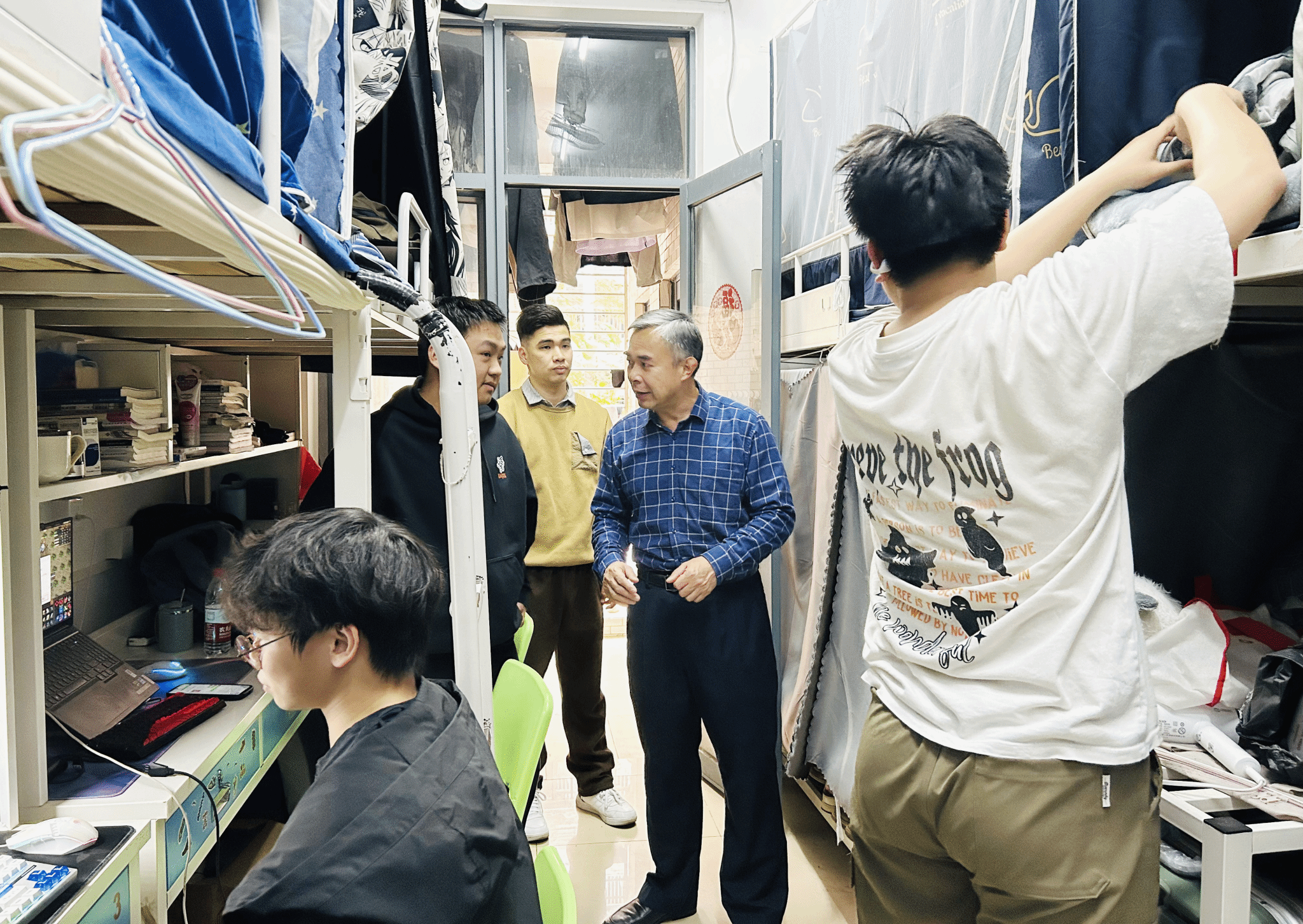 以上率下强担当,深入一线解难题。为做好学期初学生管理工作,保障新学期各项工作顺利开展。学院领导班子高度重视学期初各项工作,坚持“一线工作法”,深入师生群体听需求、解难题。开学前夕,机电工程学院党委书记江能兴带队走访学生宿舍,了解学生返校情况、课程安排、新学期规划等,现场协调解决学生遇到的困难以及提出的诉求,指导学生做好学业规划,助力学生成长成才。