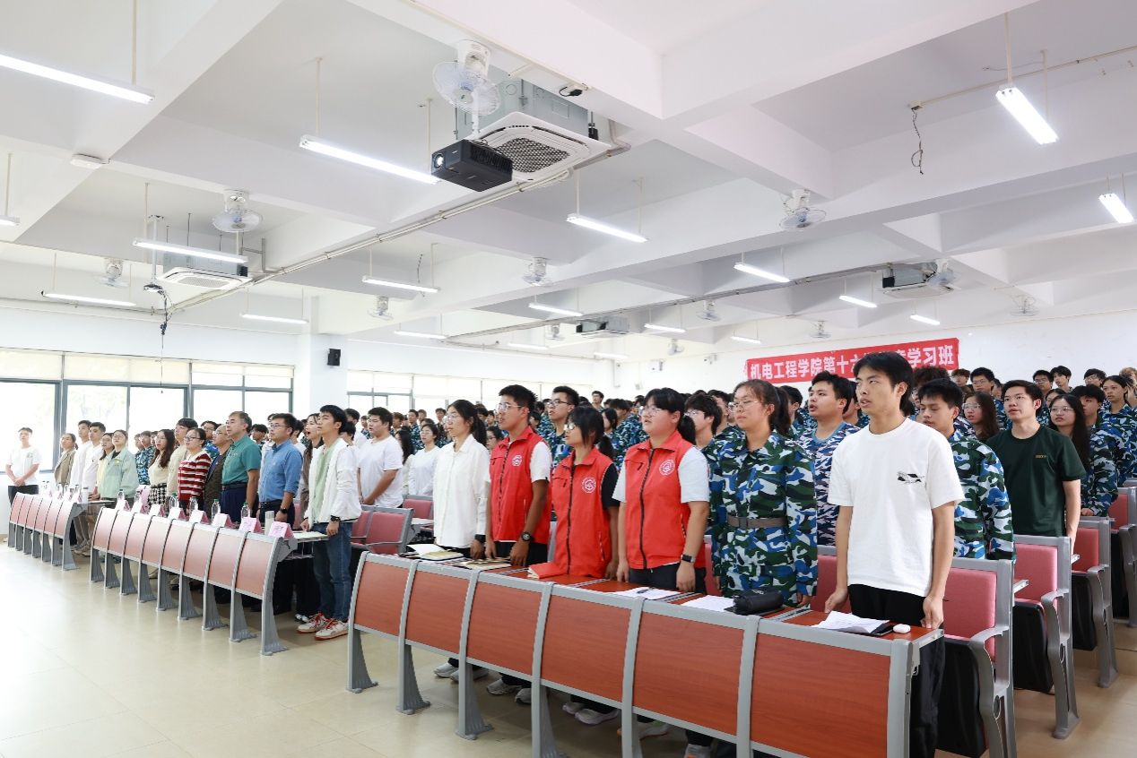 党章学习班班长林慧娴领读《机电工程学院党章学习班学员文明公约》,号召每位学员自觉遵守文明公约,爱党爱国,做有理想、敢担当、能吃苦、肯奋斗的新时代好青年。