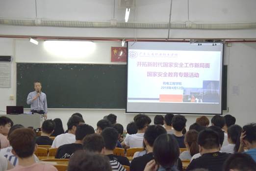 为了增强大学生国家安全意识,树立维护国家安全的理念,机电工程学院于2018年4月12日开展了以“开拓新时代国家安全工作新局面”为主题的国家安全教育专题宣传教育活动。学校安全保卫处殷志明副处长、机电工程学院党总支书记邓海荣、辅导员王景添、蔡丹妮老师和近200名学生出席了本次活动。活动由张晨婧仔老师主持。