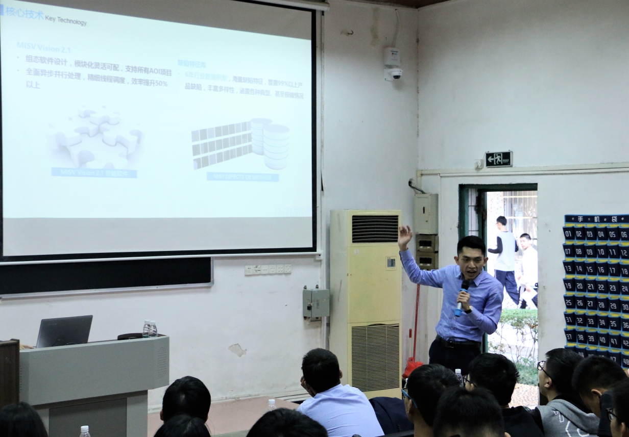 接下来,旭鑫智能科技有限公司副总经理杨铠康也为同学们进行分享。作为我院优秀校友代表,杨铠康用自身的例子和自己独特的解决问题的方法讲述了工匠精神中的“创新精神”。解决问题不能死脑筋,要多方位、多角度、多创新。让思维融入问题之中,才能达到快、准、好的解决方案。劳模不仅仅是体力上的劳,更是脑力上的劳,而“创新”则更能体现劳模的价值。