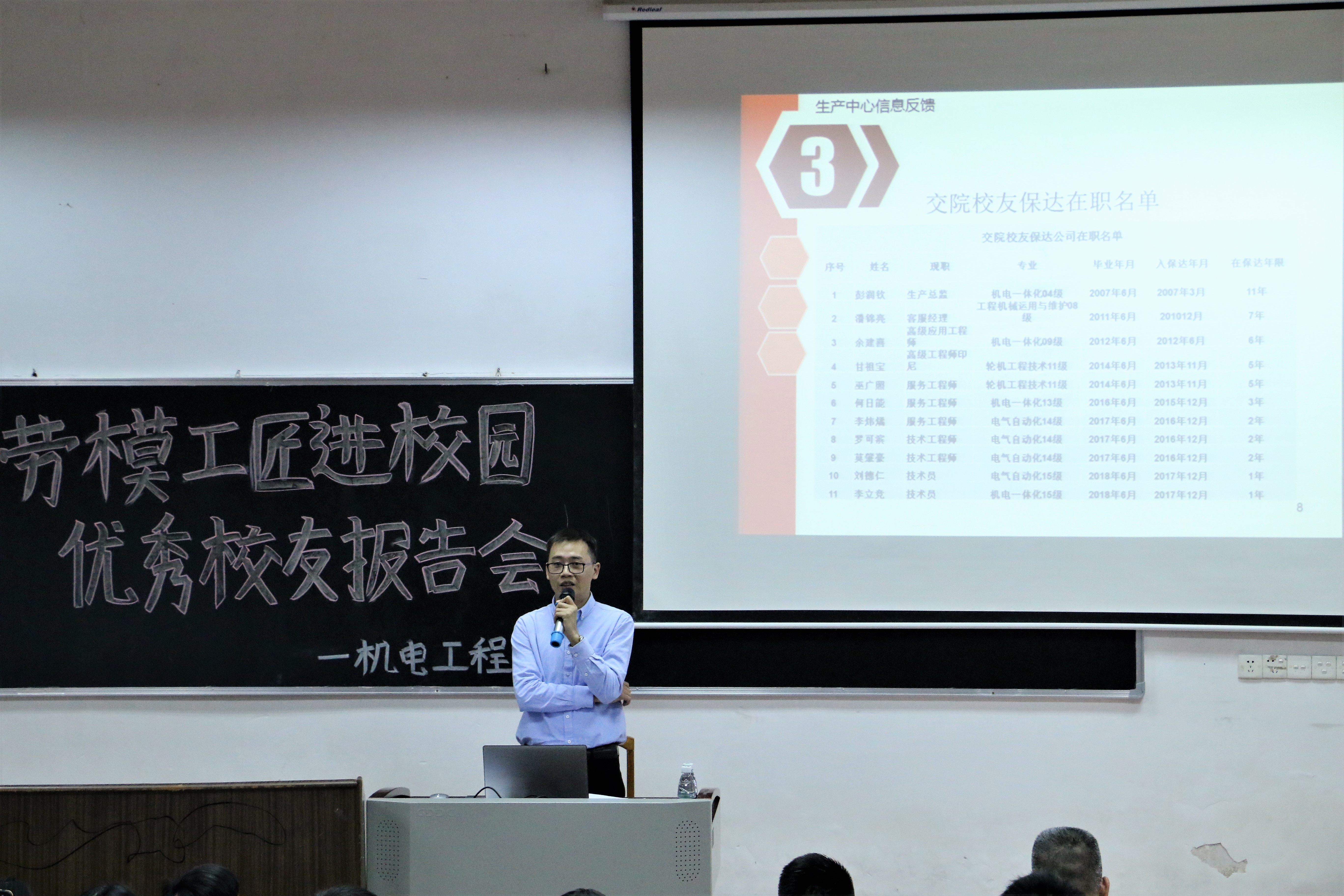 为创新教育方式,切实加强劳动教育,弘扬劳模精神、劳动精神、工匠精神,激励引导青年学生崇尚先进、学习先进、争当先进,争做德智体美劳全面发展的社会主义建设者和接班人,2018年11月29日下午,机电工程学院于16号楼001教室举办“劳模工匠进校园之优秀校友报告会”。本次大会由机电工程学院综合办主任杨伟莹老师主持,保达动力技术有限公司技术总监彭润钦和旭鑫智能科技有限公司副总经理杨铠康两位优秀校友分享了技能锤炼和拼搏奉献的工作经历。