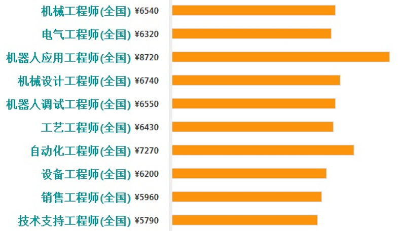 工业机器人技术专业是智能制造、机器换人计划人才紧缺专业之一,特色专业,本专业2017年开始招生。按照工信部的发展规划,到2020年,工业机器人装机量将达到100万台,大概需要20万工业机器人应用相关从业人员,预计未来8年内机器人相关行业岗位需求200万人左右。珠三角地区高职层次的“机器人运行、维护、管理和系统集成”人才的缺口较大,需求较多。 薪酬待遇同比自动化、传统制造高出很多工业机器人工程师岗位起薪差异如图1,,以深圳为例,70%的的工业机器人应用工程师月薪超过1万,如图2所示。