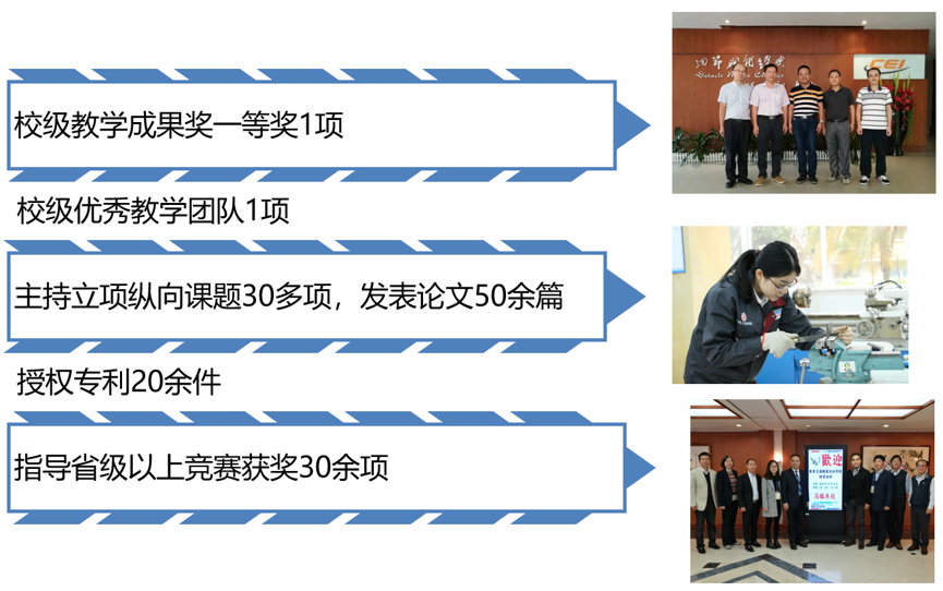 专任教师9名,其中高级职称5名,其中高级工程师3名。截止2019年6月,专业荣获校级教学成果一等奖1项,校级优秀教学团队1项,主持立项教科研课题30余项,公开发表论文50余篇,教师授权专利20多项,近5年,指导学生参加省级以上竞赛获奖30多项。校内实训室目前有7个,校外同广州擎天实业有限公司、佛山大众汽车制造公司等建立了良好的校企合作关系,与广州擎天、佛山大众汽车制造公司、云讯通科技公司、因明智能科技等企业、培训机构合作,建立了20余家校外实践基地。