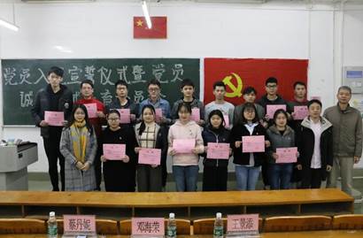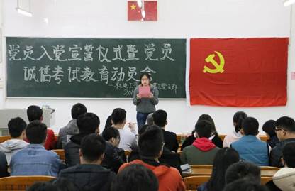 2019年1月9日下午16:30,机电工程学院于1栋101课室举行学生党员入党宣誓仪式暨期末诚信考试教育活动,出席本次活动的人员有院党总支书记邓海荣同志、第三党支部书记王景添同志、组织委员蔡丹妮同志、学生党员及17、18级入党积极分子等。