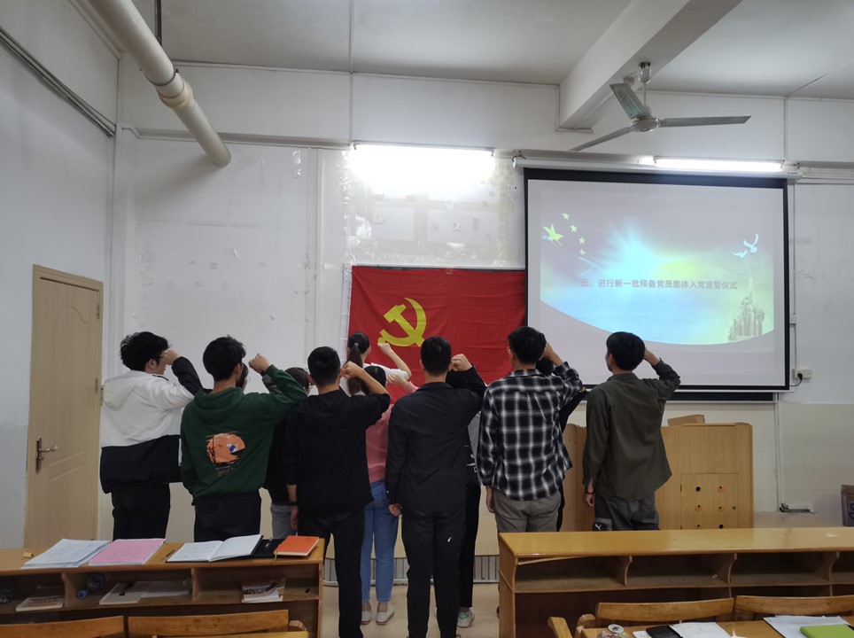 会上,进行预备党员入党宣誓仪式。学生党员们用庄严肃穆的目光注视着鲜红的党旗,用真诚响亮的誓言向党保证,不忘初心,牢记使命,随时准备为党和人民牺牲一切,永不叛党!入党宣誓是他们入党后对党的第一个保证,是他们庄严神圣的一课。
