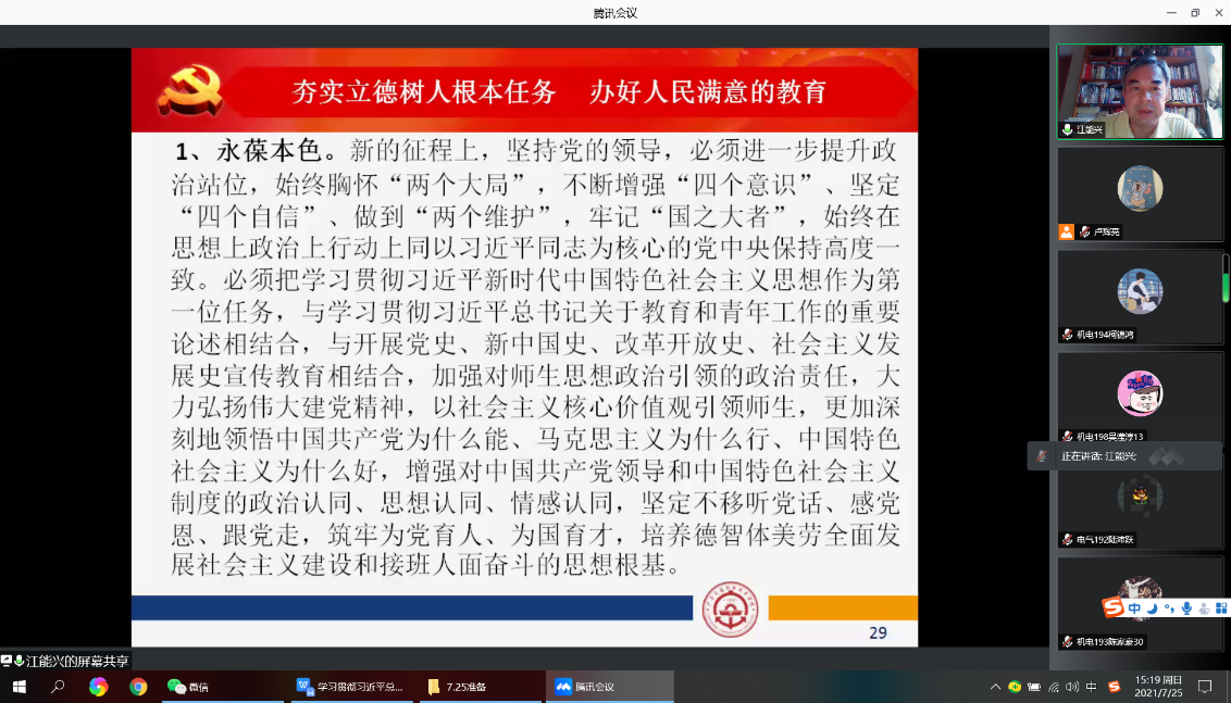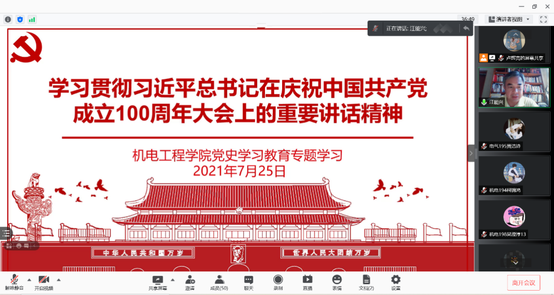 机电工程学院党委书记江能兴为全体师生党员讲授了《学习“七一”重要讲话 传承伟大建党精神 夯实立德树人根本任务》专题党课,从“32个字”、1个“号召”、3个“绝不”、3个“不负”、4个“历史阶段”、3个“一切”、2个“万岁”、9个“必须”等这些非凡数字对习近平总书记“七一”重要讲话精神进行了深入领学;并表达了自己对习近平总书记“七一”重要讲话精神的心得感受:“作为一名教师,作为伟大时代的见证者和建设者,要将总书记重要讲话精神融入到立德树人的根本任务中来,切实做好本职工作。一是要坚持党的领导,永葆本色,牢记为党育人、为国育才的初心使命;二是要积极发挥机电类高职教育的办学优势,加强党建引领下的专业建设;三是要扎实推进机电学院党、政、工、团、学、班、舍建设,抓好学风院风建设,提升学院管理服务水平。”