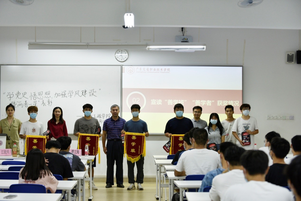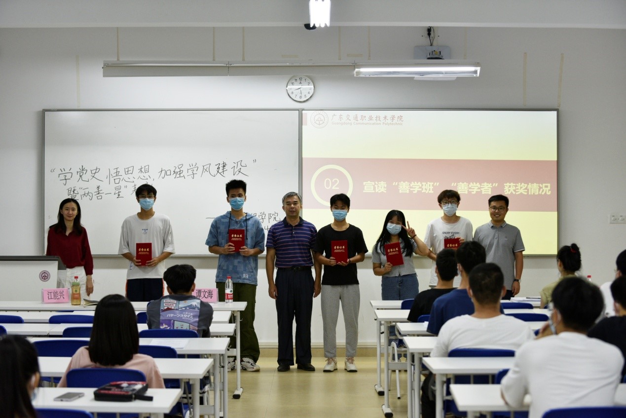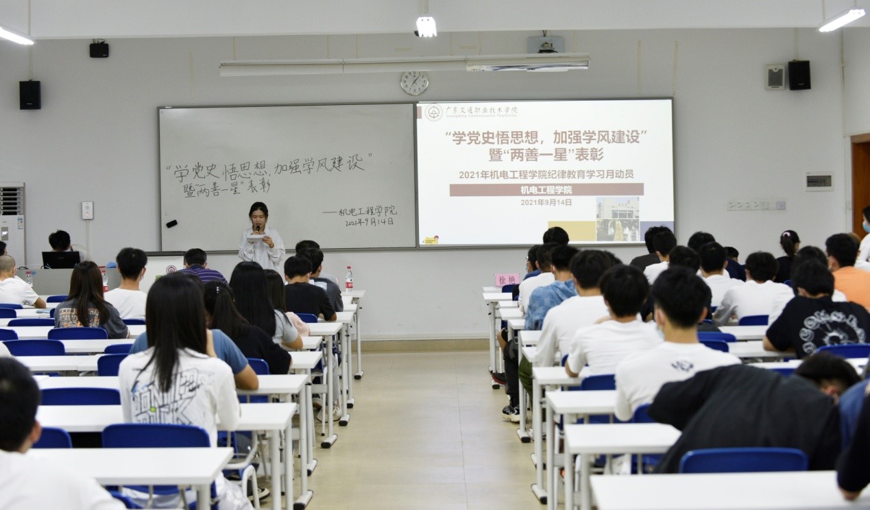 为深入学习贯彻习近平新时代中国特色社会主义思想,推动全面从严治党向纵深发展,根据《广东交通职业技术学院2021年纪律教育学习月活动实施方案》,结合我院工作实际,持续建评“两善一星”实践教育,为大学生创建一个“乐学、善学、文明、舒适”的学习和生活环境,提供一个实现“自我管理、自我服务、自我成才”的实践平台,倡导人人争当“善学者”、个个创建“善学班”、间间参评“星级宿舍”,形成大学生在校期间比学习、比服务、比行为的良好风气。2021年9月14日晚,机电工程学院在立业楼308开展了“学党史悟思想,加强学风建设”暨“两善一星”表彰,出席本次会议的有机电工程学院党委书记江能兴、辅导员、“两善一星”获得者、各班团干部,全体2021级助班、心辅。