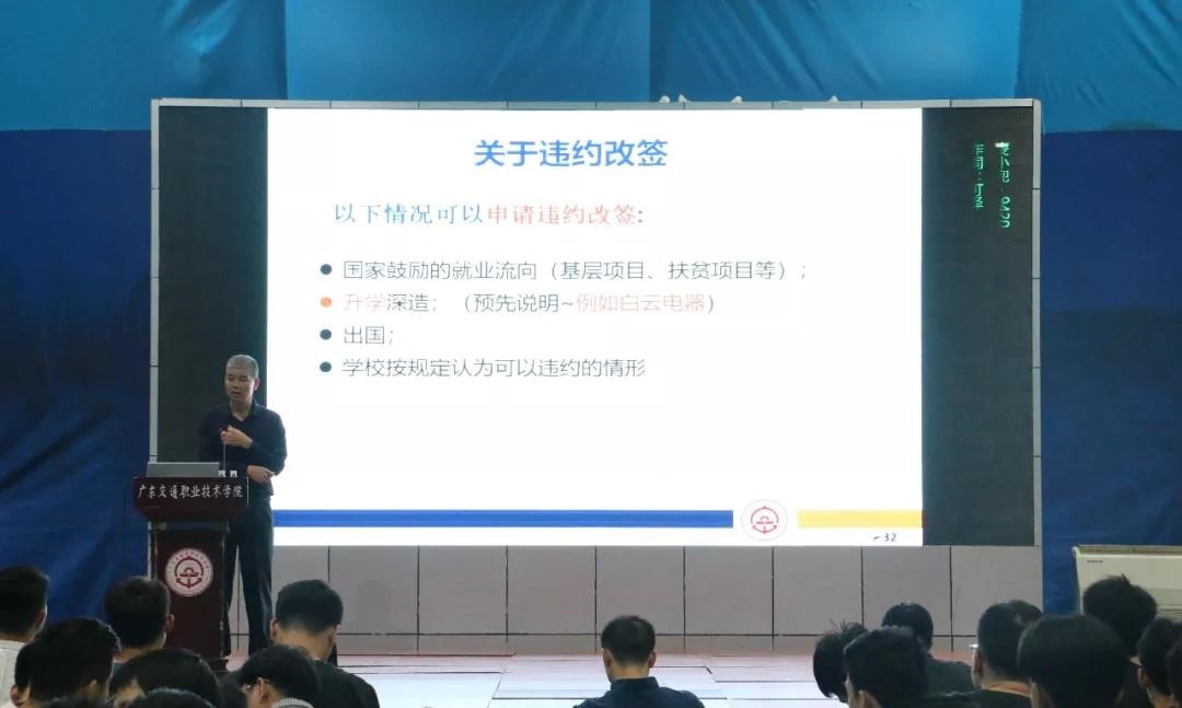 其次,邓书记从花都校区和天河校区两场大型校园招聘会和近期机电学院举办的多场招聘会入手,对2020届毕业生开展就业指导。针对就业形势,邓书记提出了以下几点建议:一是认清就业形势,摆正就业心态,充分认识就业形势的多样化。二是广泛联系,主动出击,不能"等,靠,要”。三是及时上学院网站了解就业信息,及时与班主任、就业指导员联系。四是充分准备,不随便丢掉一次面试的机会和放弃一份工作。同时要求同学们熟练专业技能,考取核心专业证书;在校内遵纪守法,做到文明离线;外出期间注重人身安全,交通安全,生产实习安全等;特别注意与学校,老师,家长保持联系。