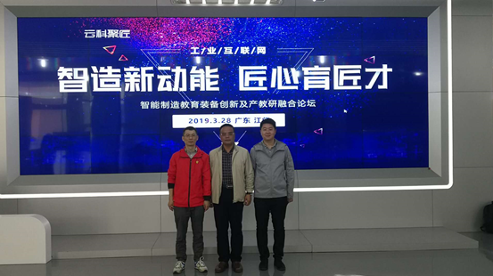 3月28日,机电工程学院院长潘伟荣教授、张毅及翟振坤老师一行到广东江门参加了以“智造新动能·匠心育匠才”为主题的“智能制造教育装备创新及产教研融合论坛暨德国 AHK Meister 培训基地揭牌仪式”。广东省江门市工业和信息化局、五邑大学智能制造学部、苏州健雄职业技术学院双元制培训学院、AHK中德双元制职业教育示范推广基地、沈阳机床股份有限公司等智能制造相关合作院校和企业领导和嘉宾约150人出席了本次论坛。