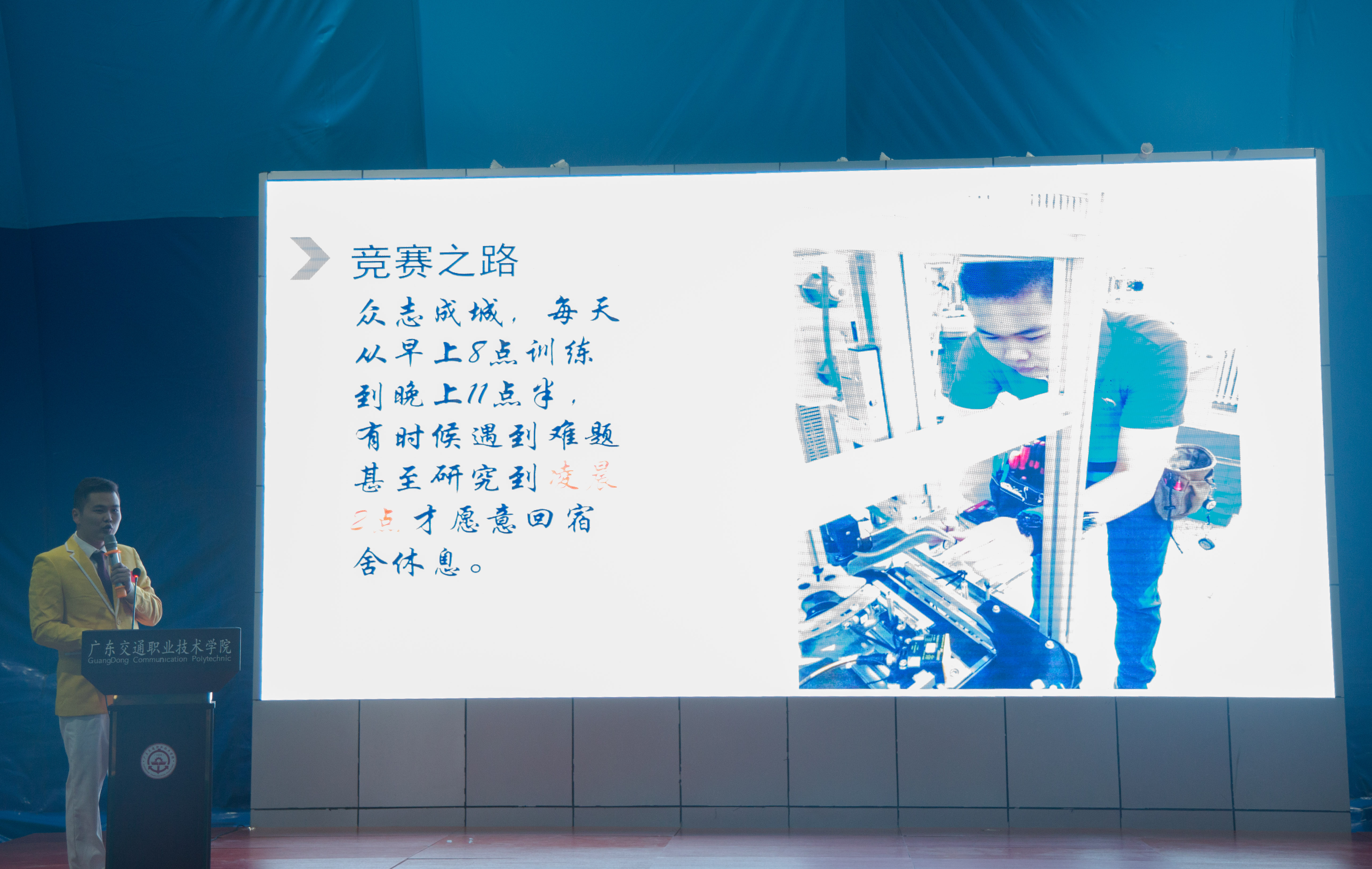 “坚持不一定胜利 ,放弃一定失败”,“障碍与失败,是通往成功最稳靠的踏脚石,肯研究利用它们,便能从失败中培养出成功”,“细节决定成败”。报告会上,全国青年岗位能手,第44届世界技能大赛机电一体化项目冠军、广东省岭南工商第一技师学院教师、黄金搭档叶子进和邓燚祯分享了他们在2016年比赛失利后,以坚定的信念和顽强的毅力,克服种种困难,最终在2017年世界技能大赛上夺冠的经历。