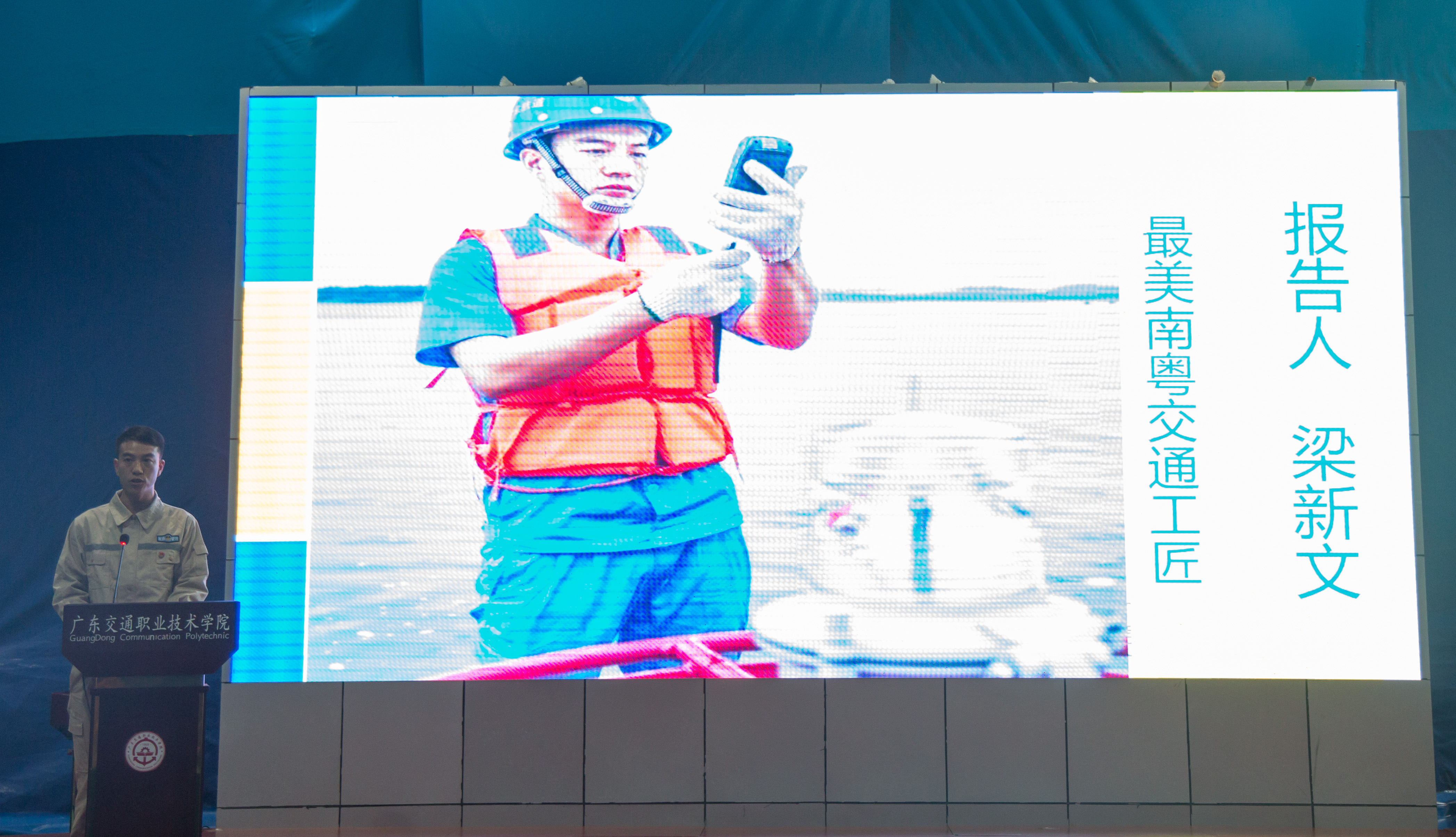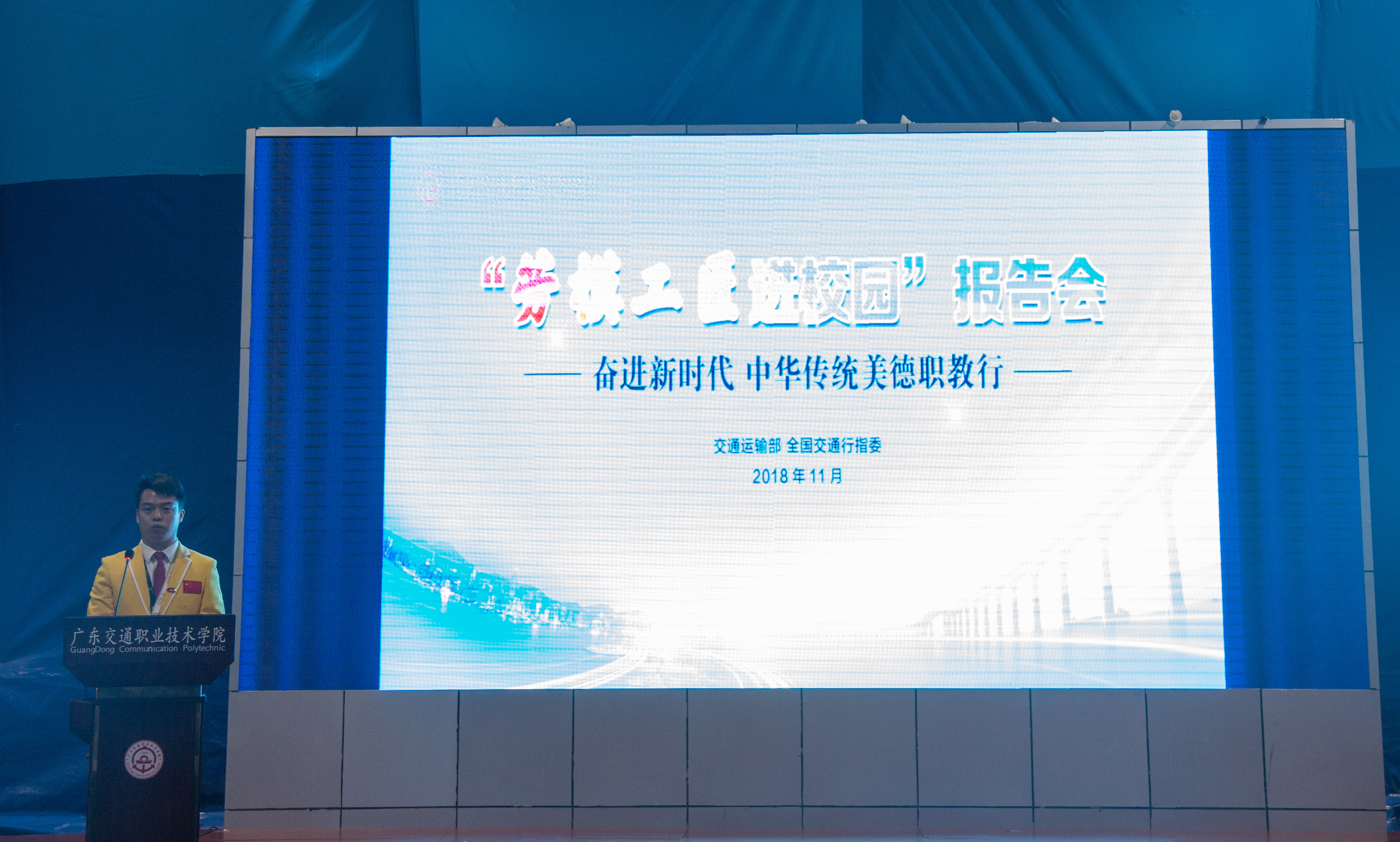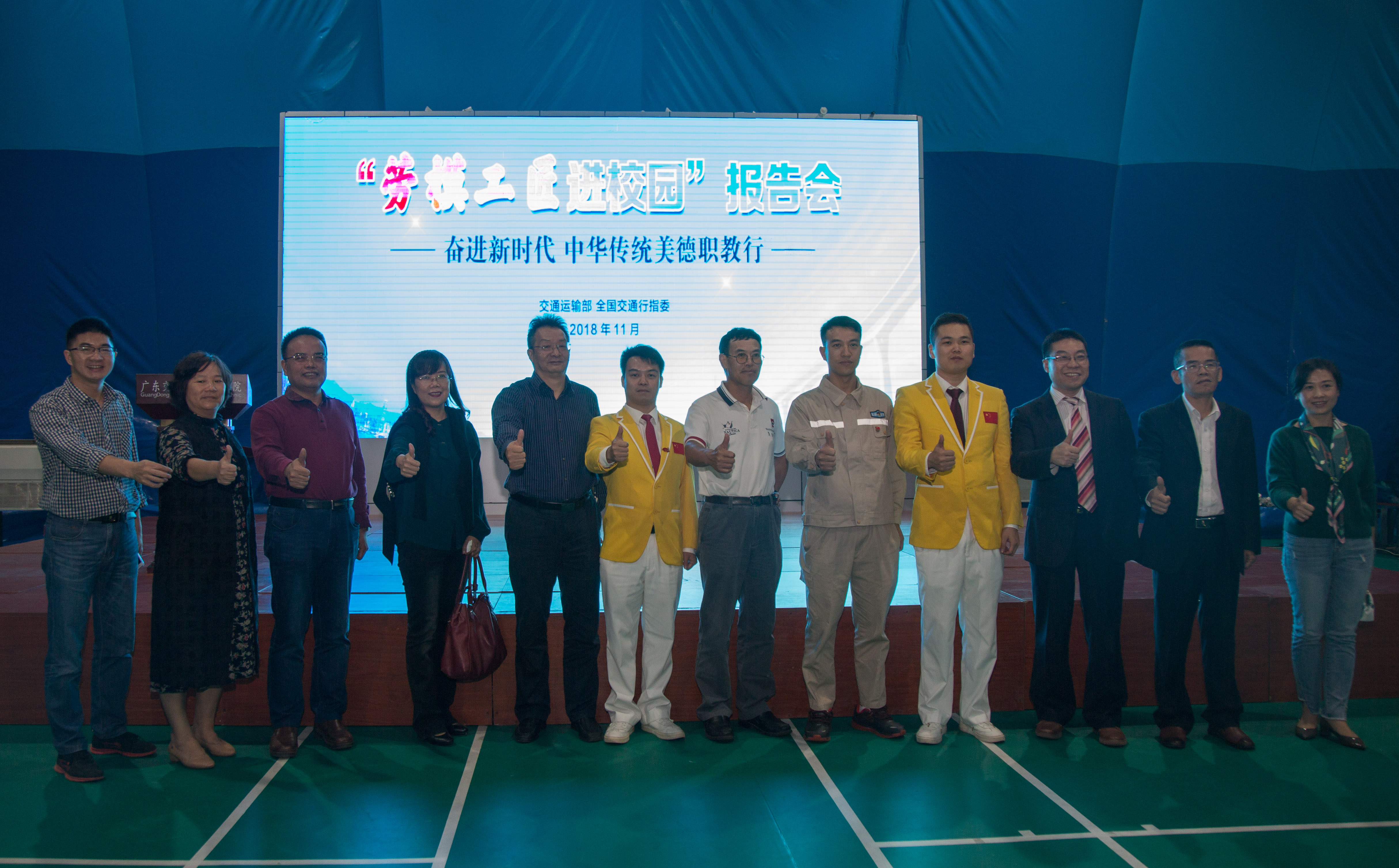 2018年11月19日,“劳模工匠进校园”第二场报告会在花都校区文体中心举行。“最美南粤交通工匠”杨东来、梁新文,世界技能大赛机电一体化项目金牌获得者叶子进、邓燚祯等四位劳模工匠分享了技能锤炼和拼搏奉献的经历,七百余名师生一起聆听了报告会。报告会由教务处王劲松处长主持。