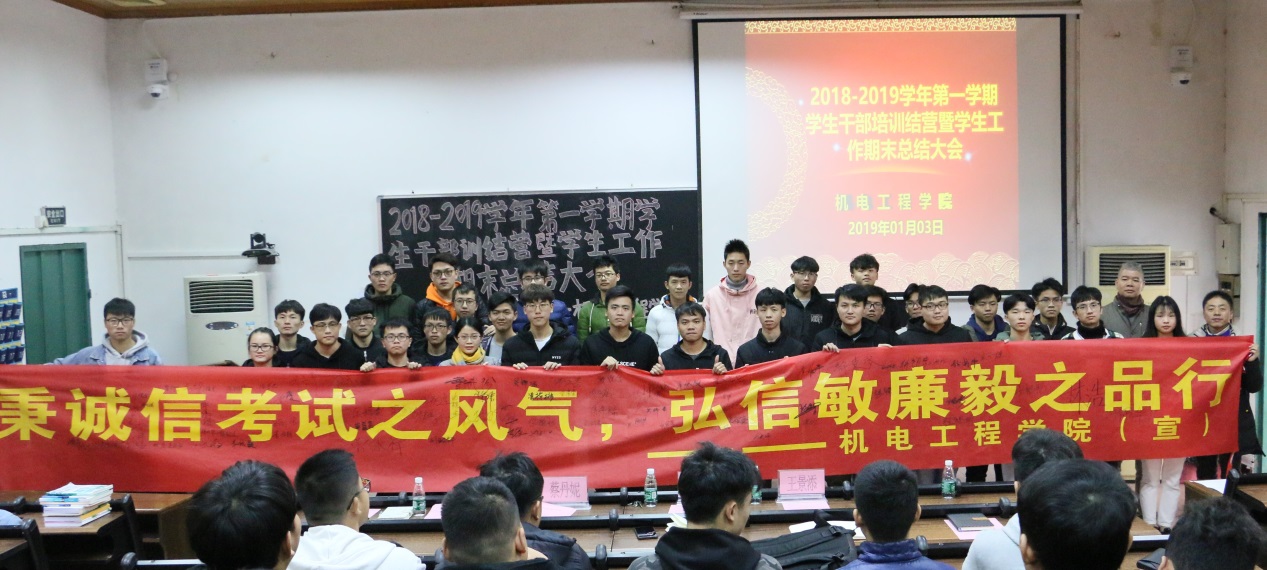 并深化机电工程学院学风建设,激励全院学生努力学习、奋发向上,机电工程学院于2019年1月3日下午在16栋001教室举办学生干部培训营结营仪式暨学生工作期末总结大会。党总支书记邓海荣、分团委书记王景添、辅导员蔡丹妮老师和各班学生代表、干部代表共200余人参加了本次大会。