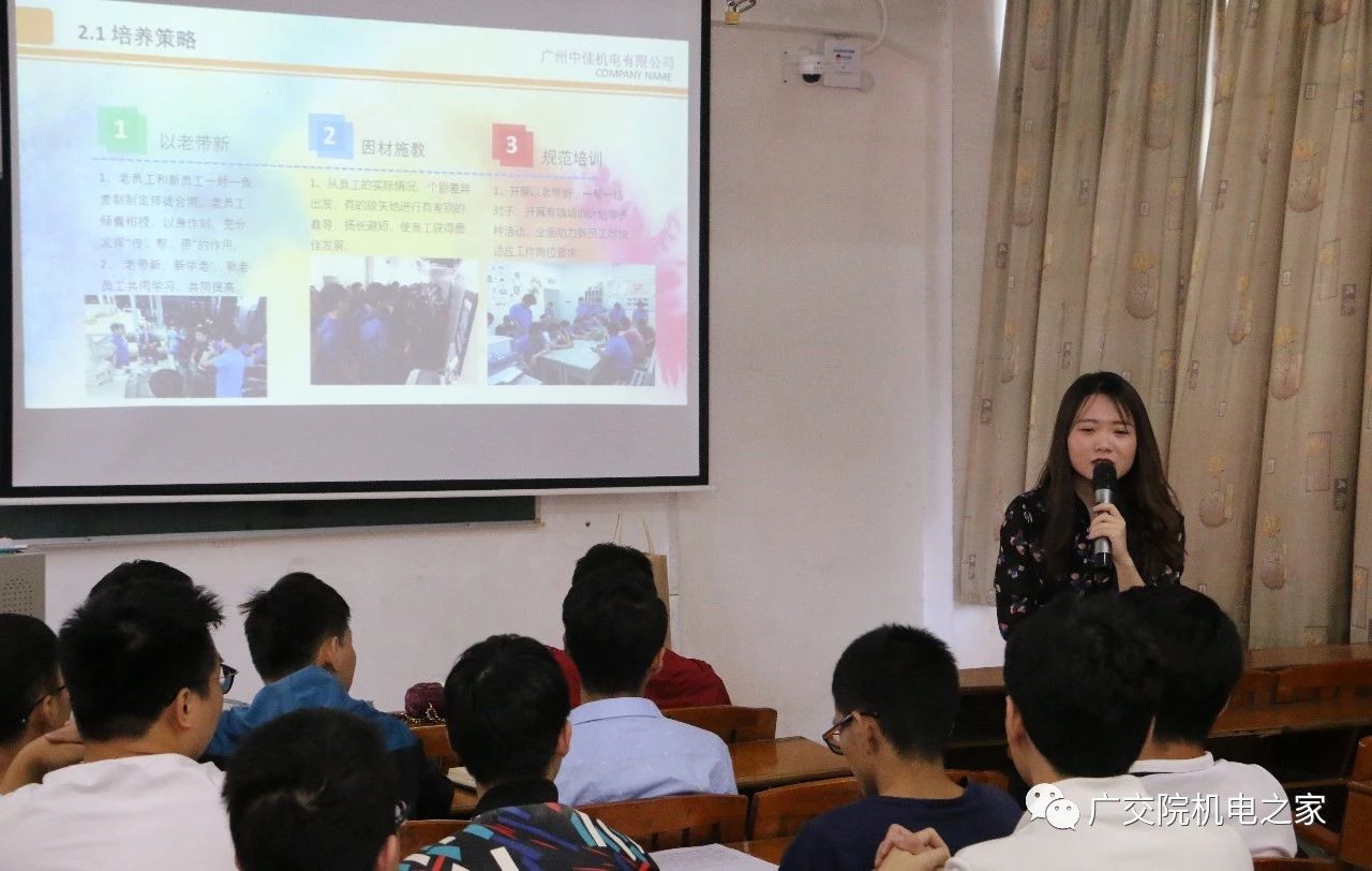 招聘会上,广州中佳机电有限公司的曾清蓉副总经理首先向学生发放招聘宣传册,随后借助视频、PPT等形式,简要的介绍了公司的企业文化、企业概念等企业相关的信息,并详细说明了实习生培训方面的工作、福利、待遇等情况,然后重点强调了对人才的需求和应聘者的专业技术能力,同时,希望应聘者拥有吃苦耐劳的精神。同学们积极提出相关疑问,曾副总经理也给予了明确的答案,并为学生提出实用性的建议。