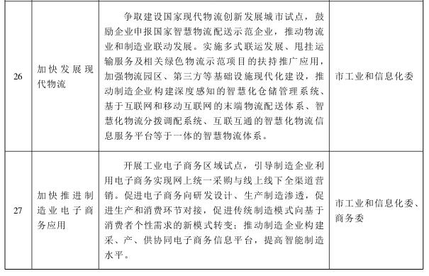 争取建设国家现代物流创新发展城市试点,鼓励企业申报国家智慧物流配送示范企业,推动物流业和制造业联动发展。实施多式联运发展、甩挂运输服务及相关绿色物流示范项目的扶持推广应用,加强物流园区、第三方等基础设施现代化建设,推动制造企业构建深度感知的智慧化仓储管理系统、基于互联网和移动互联网的末端物流配送体系、智慧化物流分拨调配系统、互联互通的智慧化物流信息服务平台等于一体的智慧物流体系。