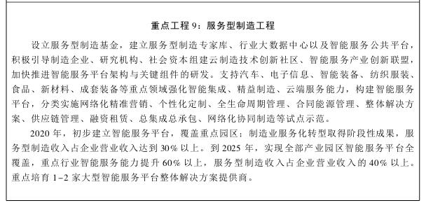 实施服务型制造与“互联网+服务”示范试点,鼓励企业通过兼并重组等方式向价值链两端拓展,促进“生产型制造”向“服务型制造”转变。面向汽车、装备制造、纺织服装、物流、能源、医疗器械等重点领域开展智能服务试点示范工作,积极引导制造企业以用户为中心构建智能服务平台,推动制造企业向个性化定制、整体解决方案、全生命周期管理等高端服务发展。