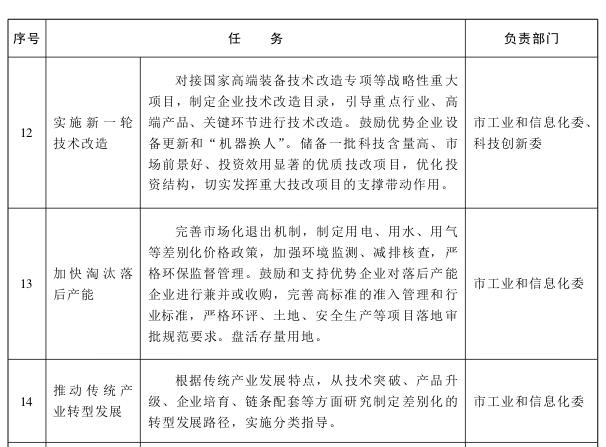 根据传统产业发展特点,从技术突破、产品升级、企业培育、链条配套等方面研究制定差别化的转型发展路径,实施分类指导。推动食品饮料、家居家电、灯光音响、电子产品等优势传统产业加大研发投入,提升品牌,提高产品层次,实现整体转型升级。加快纺织、服装、鞋帽、制革等传统产业淘汰落后生产工艺和设备,提升技术工艺水平。