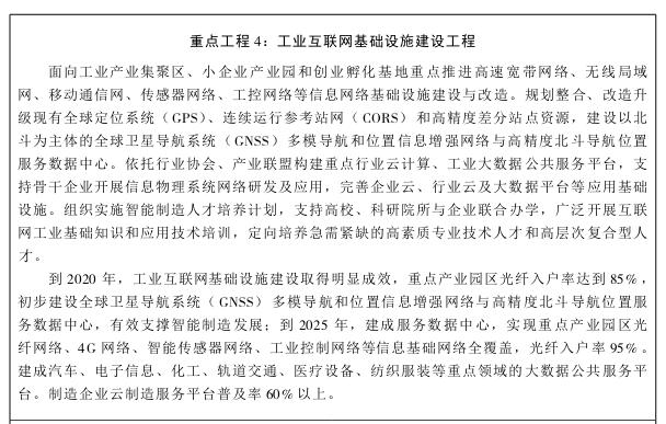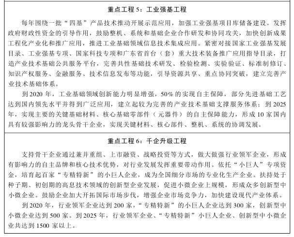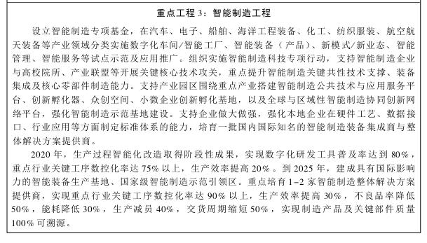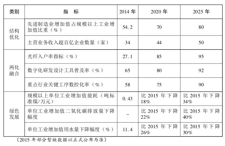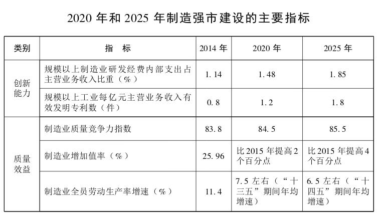 到2025年,制造业整体素质大幅提升,创新能力显著增强,两化融合迈上新台阶,质量效益名列国内前茅。拥有一批国际知名、国内领先的跨国公司和产业集群,在全球产业分工的地位显著提升,产业链向附加值高的部分充分延伸。重点行业单位工业增加值能耗、物耗及污染物排放达到世界先进水平。