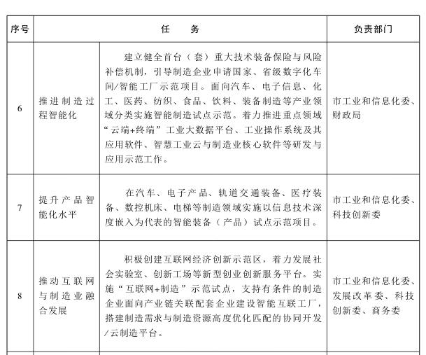 建立健全首台(套)重大技术装备保险与风险补偿机制,引导制造企业申请国家、省级数字化车间/智能工厂示范项目。面向汽车、电子信息、化工、医药、纺织、食品、饮料、装备制造等产业领域分类实施智能制造试点示范。着力推进重点领域“云端+终端”工业大数据平台、工业操作系统及其应用软件、智慧工业云与制造业核心软件等研发与应用示范工作。