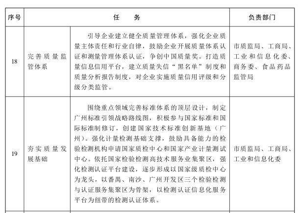 围绕重点领域完善标准体系的顶层设计,制定广州标准引领战略路线图,积极参与国家标准和国际标准制修订,创建国家技术标准创新基地(广州)。强化计量检测基础支撑,鼓励具备能力的检验检测机构申请国家质检中心和国家产业计量测试中心。依托国家检验检测高技术服务业集聚区,强化检测认证平台建设,逐步形成以国家级质检中心为龙头,以番禺、南沙、广州开发区3个检验检测与认证服务集聚区为骨架,以检测认证信息化服务平台为纽带的检测认证体系。