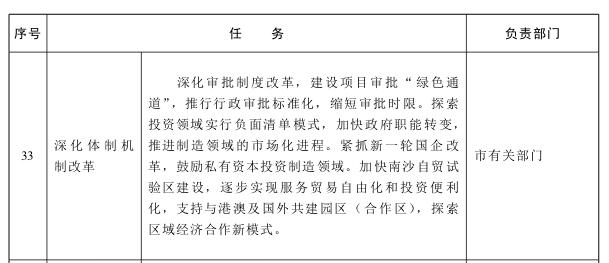 深化审批制度改革,建设项目审批“绿色通道”,推行行政审批标准化,缩短审批时限。探索投资领域实行负面清单模式,加快政府职能转变,推进制造领域的市场化进程。紧抓新一轮国企改革,鼓励私有资本投资制造领域。加快南沙自贸试验区建设,逐步实现服务贸易自由化和投资便利化,支持与港澳及国外共建园区(合作区),探索区域经济合作新模式。