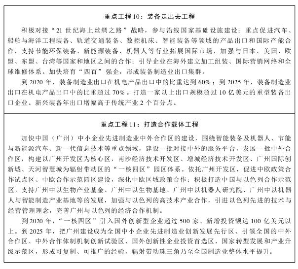 “一带一路”战略重要支点和开放高地。贯彻落实丝绸之路经济带和21世纪海上丝绸之路等重大战略部署,实施更为积极的开放战略,将“引进来”和“走出去”更好地结合起来,进一步扩大制造对外开放,积极参与和推动国际产能合作,加快中国(广州)中小企业先进制造业中外合作区的建设,打造合作新载体,提升国际合作的水平和层次,推动装备等优势产业国际化布局,实施装备走出去工程,重点促进汽车、船舶、摩托车、海洋工程装备、轨道交通装备、智能装备等领域的产品出口和国际产能合作,支持节能环保装备、新能源装备、机器人等行业拓展国际市场,引导企业提高跨国经营能力和国际竞争力,打造“一带一路”战略重要支点和开放高地。