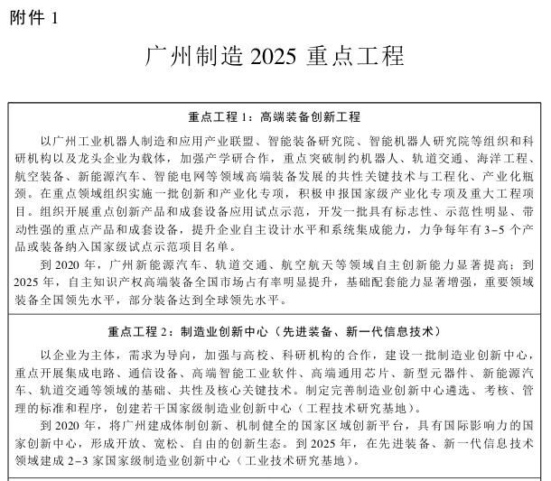 全国重要的高端装备制造业创新基地。强化企业技术创新主体地位,提高创新设计能力,以中国(广州)智能装备研究院、广州中国科学院工业技术研究院、相关大学等组织和科研机构以及龙头企业为载体,加快推进科技成果产业化,进一步完善制造业创新体系;实施高端装备创新工程和制造业创新中心建设工程,在节能与新能源汽车、轨道交通、船舶与海洋工程、智能成套设备等重点领域推动实施一批创新和产业化专项,申报一批国家级或重大工程项目,建设若干国家级制造业创新中心(工业技术研究基地),打造全国重要的高端装备制造业创新基地。