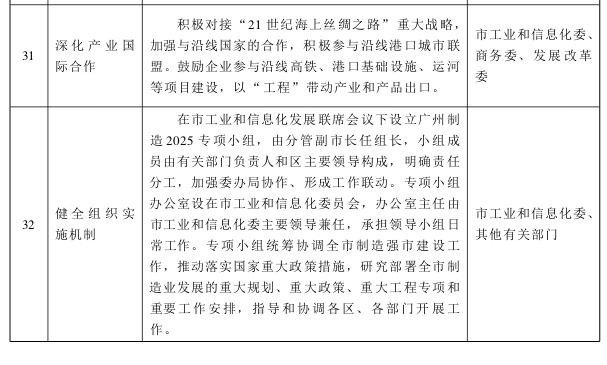 在市工业和信息化发展联席会议下设立广州制造2025专项小组,由分管副市长任组长,小组成员由有关部门负责人和区主要领导构成,明确责任分工,加强各区、各部门协作,形成工作联动。专项小组办公室设在市工业和信息化委,办公室主任由市工业和信息化委主要领导兼任,承担专项小组日常工作。专项小组统筹协调全市制造强市建设工作,推动落实国家重大政策措施,研究部署全市制造业发展的重大规划、重大政策、重大工程专项和重要工作安排,指导和协调各区、各部门开展工作。