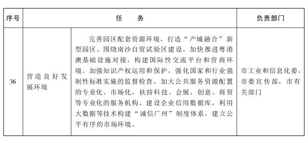 高起点、高标准建设园区,完善园区配套资源环境,打造“产城融合”新型园区。围绕南沙自贸试验区建设,加快推进粤港澳基础设施对接,构建国际性交流平台和营商环境。加强知识产权运用和保护,强化国家和行业强制性标准实施的监督检查,加快推进中新广州知识城建设。加大公共服务资源配置的专业化、市场化,扶持科技、会展、创意、商贸等专业化的服务机构。建设企业信用数据库,利用大数据等技术构建“诚信广州”制度体系,建立公平有序的市场环境。