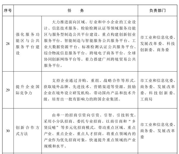 大力推进面向区域、行业和中小企业的工业设计、信息技术服务、检验检测认证等领域服务功能区与服务型制造公共平台建设。重点构建创新创业服务平台、智能制造与智能服务公共服务平台、工业大数据资源平台、标准检测认证公共服务平台、综合物流信息服务平台、跨境电子商务平台、全球协同创新网络平台等7大公共服务平台支撑体系。着力搭建广州跨境贸易公共服务平台,为国际贸易企业提供海外战略咨询、法律援助、人才培训等服务,降低企业“走出去”的战略风险。